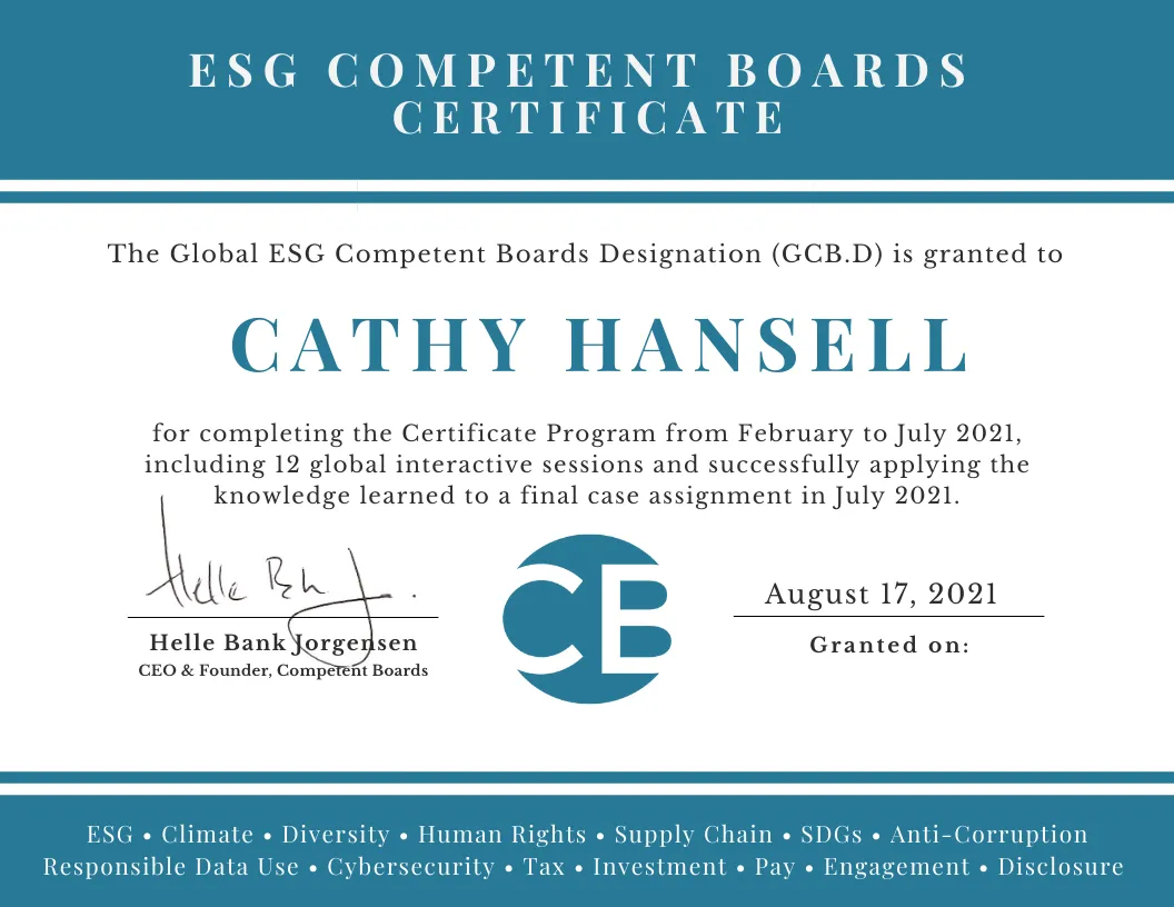 Cathy is a certified Malcolm Baldrige examiner and holds nine trainer certifications in quality and six sigma approaches. Cathy is also a certified CSR practitioner, Certified ESG Board Advisor and a BCSP Certified Safety Management Professional.